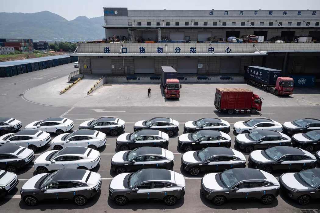 5月,重庆铁路集装箱中心站,等待出口到泰国的电动汽车。