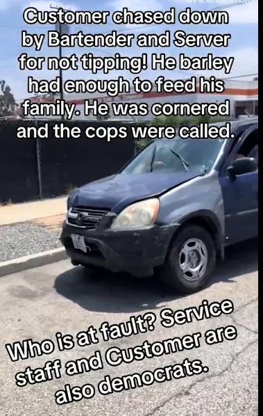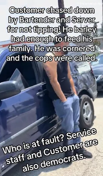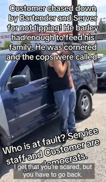 一名男子在餐厅用餐后没有留下小费,刚走出门,就被两名服务员和酒保一路追到停车场。视频中,他们甚至用车挡住男子的去路,要求他“回来补上小费”。