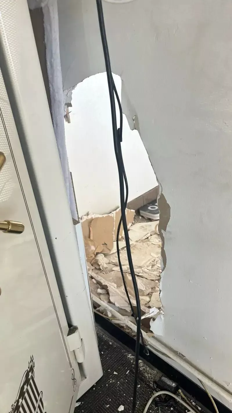 李女士进一步发现,店铺与隔壁相连的墙壁上被挖出一个大洞。原本的隔壁是一家奶茶店,约半个月前已搬离,目前店内空无一物,屋顶却出现一个大洞,还有梯子垂落下来。她推测,嫌犯是从隔壁屋顶潜入后,在共用墙壁打洞进入珠宝店作案。