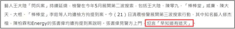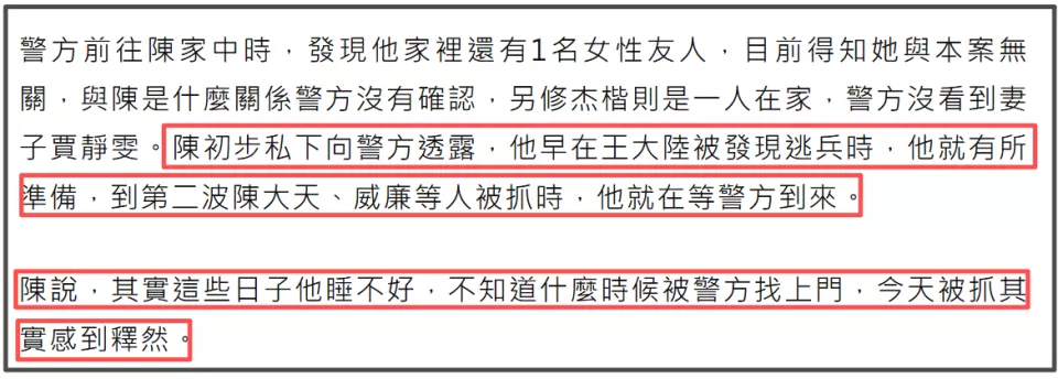 据悉,陈柏霖被抓走时家里还有一位女性友人,不知是不是女友。陈柏霖态度倒也坦然,向警方透露早在王大陆被发现逃兵役时,自己就有所准备,到棒棒堂威廉等人第二波被抓后,他就等着警方来。陈柏霖甚至直言,因为这件事,这些日子他自己也睡不好,如今被抓感到释然了。