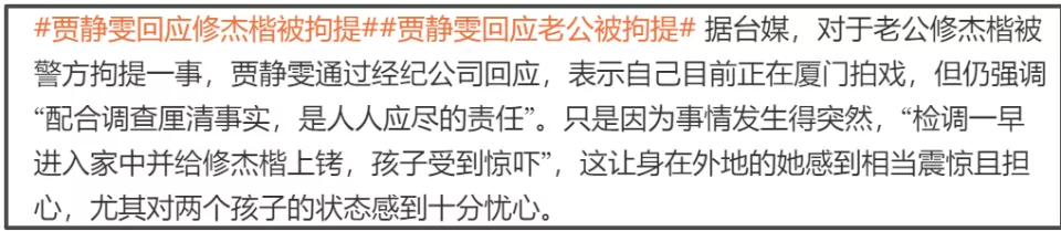 不过因为事发突然,检警大清早进门给修杰楷上铐,导致家里的孩子受到惊吓,让身在外地的贾静雯感到相当震惊且担心,尤其对两个孩子的状态感到十分忧心。