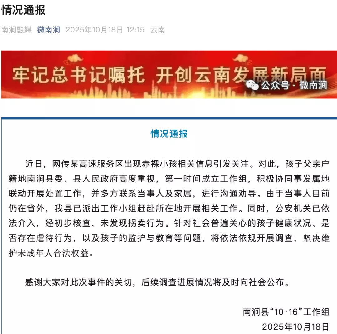 10月18日,南涧县“10·16”工作组发布情况通报称,公安机关已依法介入,经初步核查,未发现拐卖行为。