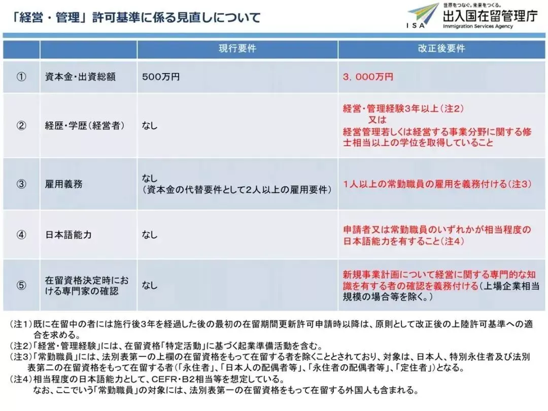 根据10月10日发布的经营管理新规,日本拟对经营管理签证提出的新要求还包括:至少雇佣一名日籍或永驻等身份的常勤员工、对申请人或员工有日本语能力检测N2以上水平的语言要求,最后,还对申请人的学历和工作经验做出了具体要求——至少具有3年经营管理经验,或者具有相关专业硕士以上文凭。