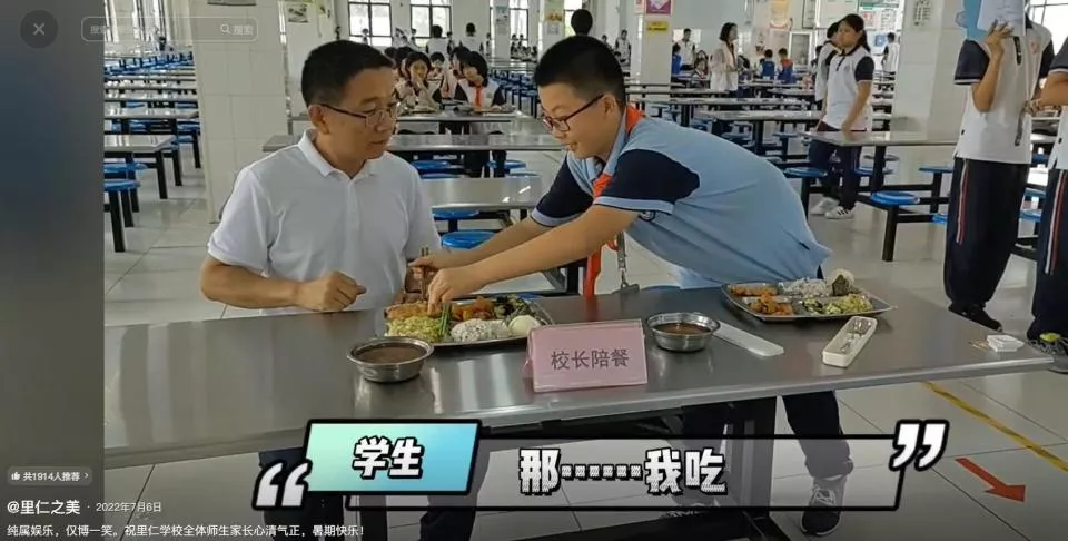 校长苗本臣此前受到网络关注走红,源于一段三年前的娱乐视频。2022年7月,里仁学校发布的一段苗本臣在陪餐时被学生“抢”了鸡排和粽子的视频。视频中,一名男生拿着自己盘子里的鸡排问校长:“校长你吃鸡排吗?”校长回答“不吃”,学生立马从校长盘子里“抢”走了鸡排。