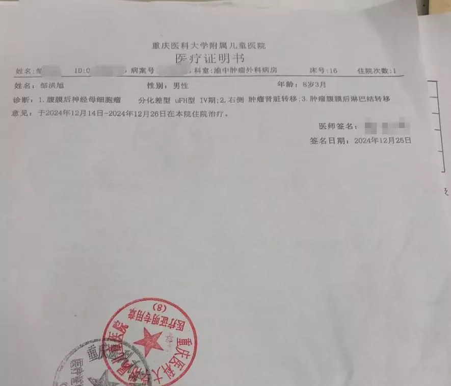 医疗证明书显示,小雨患有腹膜后神经母细胞瘤四期,右侧肿瘤肾脏转移,肿瘤腹膜后淋巴结转移。公开资料显示,神经母细胞瘤是一种恶性肿瘤,起源于未成熟的神经细胞,是典型的“儿童期癌症”,其恶性程度高、病情凶险,治疗起来难度极大,被称作“儿童肿瘤之王”。