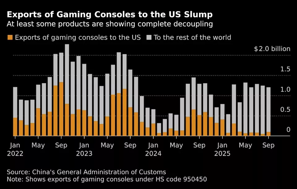 游乐器出口大幅下滑,任天堂和微软等公司选择从越南等地发货,以避免从中国出口所需支付的高额关税。美国消费者也开始从其他地区购买电视机,上季度中国液晶电视对美出口额下降了73%。