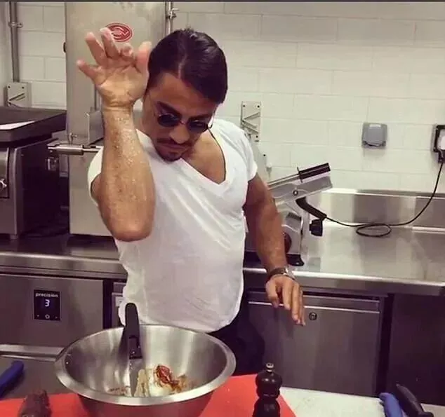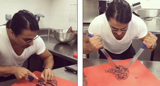 时间来到2017年,他的一段36秒的“Ottoman Steak”视频出现在了互联网上,视频里他利落地切开牛排后,突然摆出一个极其妖娆的姿势——左腿微屈,右臂高高举起,手指优雅地捻起一撮盐粒。