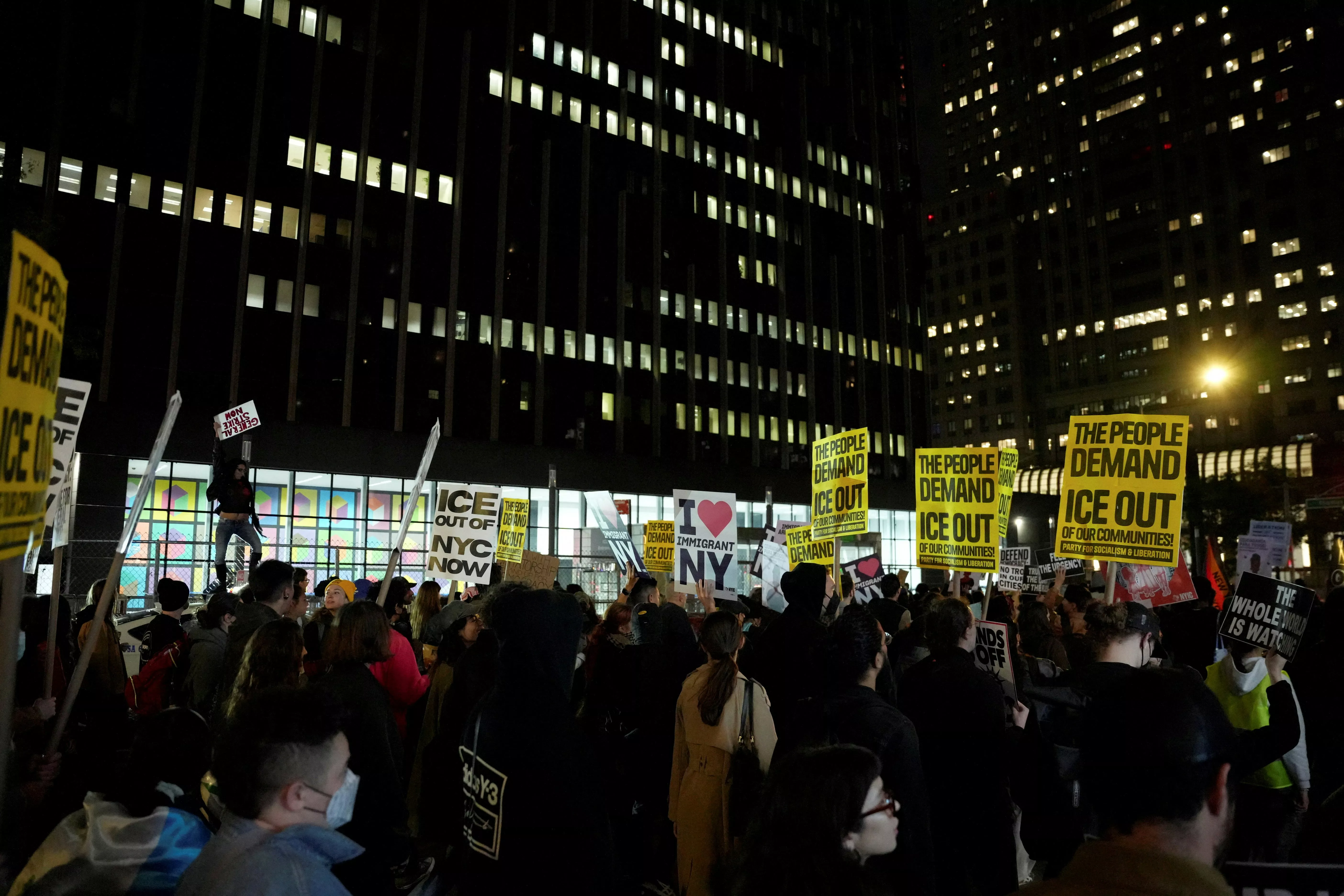 2025年10月22日,美国纽约市曼哈顿移民法庭外,民众举着标语抗议移民和海关执法局(ICE)。(Reuters)