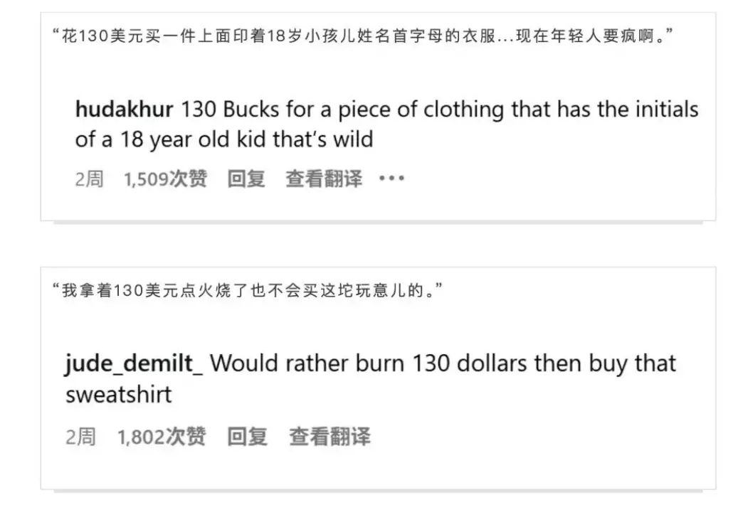 只不过,一件运动衫标价130美元(约926元人民币)的做法还是引起了部分网友的不满,认为其在“割韭菜”。