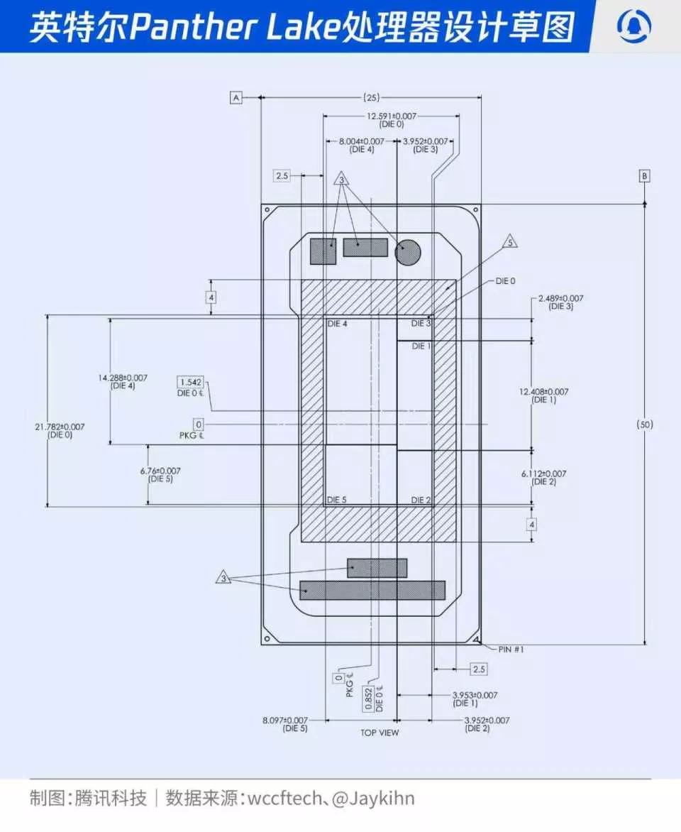 4为CPU,面积114.3mm²,采用18A工艺,考虑到不同配置CPU的DIE SIZE差异,CPU