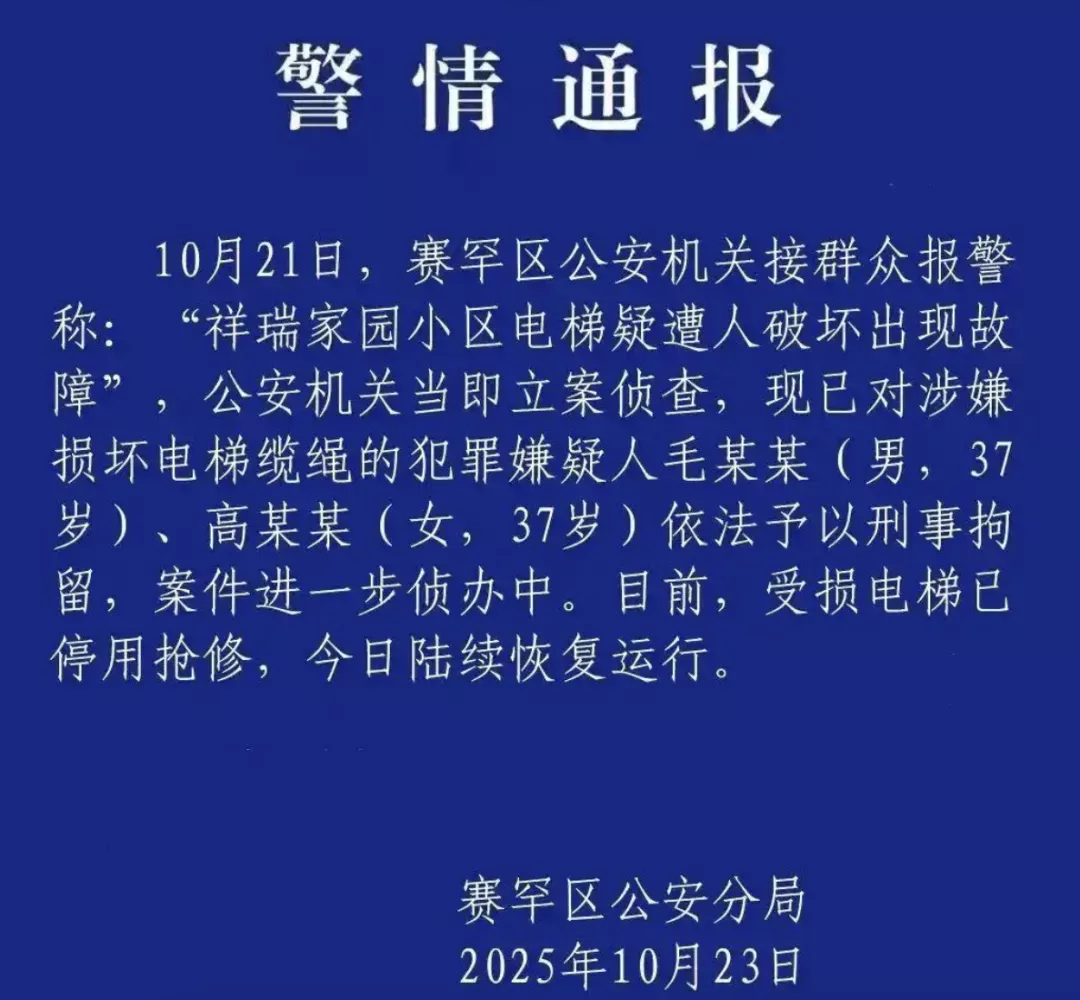 另一件事新闻媒体在今天上午已经报道过了,内蒙古祥瑞家园小区里,50部电梯中,有23部的钢绳被一男一女恶意切割。万幸的是电梯检修人员正好日常巡检并发现了问题,尚未造成伤亡。