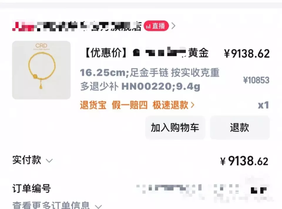 消费者宝珠(化名)就是这波双十一“买金者”之一。她在金价上涨前就养成了定期购金的习惯,而在金价进入上行通道后,她开始有意识地囤金。上周,金价连续上涨,恰逢双十一,各大电商平台主打的“黄金券”吸引了她的目光。她在某电商平台抢到两张黄金券,抱着“不买好像亏了”的心理,以9138元购入一条9.4克足金手链。然而,她却在两日内遭遇金价连续回调,最终选择退货。