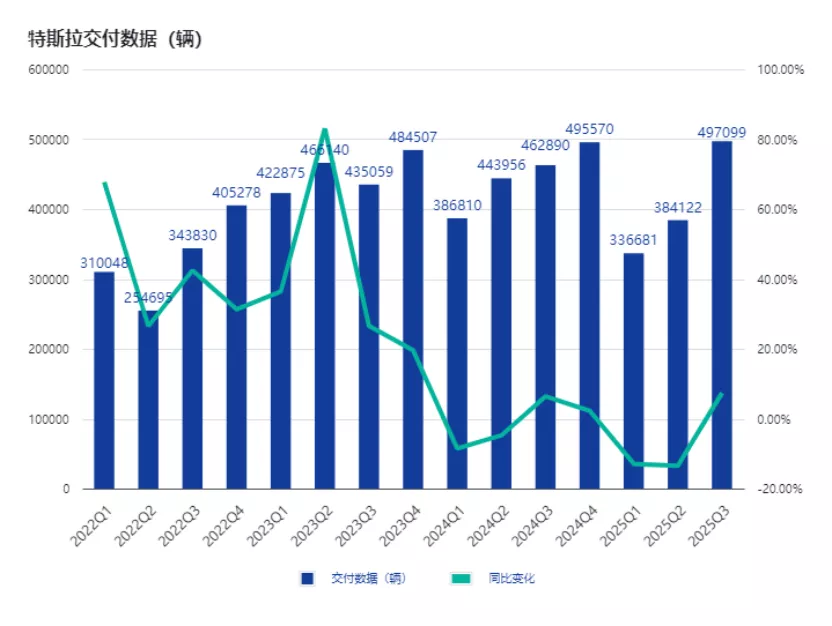 一方面美国政府为合格电动车提供7500美元的联邦税收抵免,这个优惠在2025年9月30日到期,所以很多消费者都赶在三季度结束之前完成购买;另一方面,从2022年到现在每个季度的增速曲线不难看出,特斯拉交付规模的同比增速在大幅下滑。