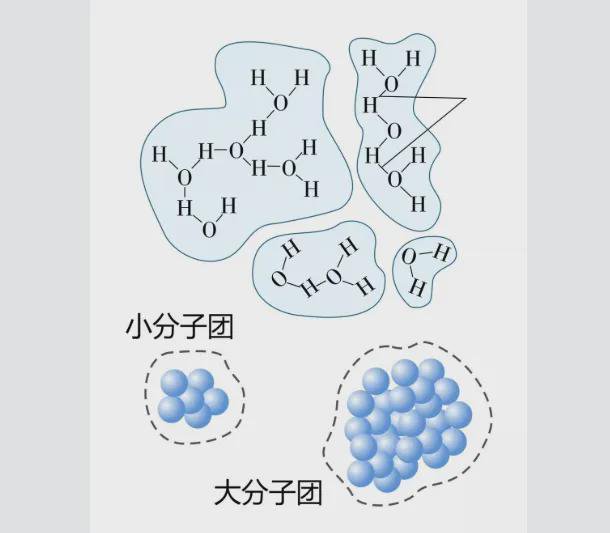 什么叫小分子水呢?按照推广视频里面的说法,普通的水,往往是由15到20个水分子,通过氢键作用聚合在一起而形成的分子团簇,这种形态被称为大分子团水。在某些情况下,连接力较弱的氢键将会被切断,使分子团簇散架,变成更小的水分子团,只有5到6个分子组队,具有更高的活性,更容易穿透细胞膜,从而带来各种“健康益处”。