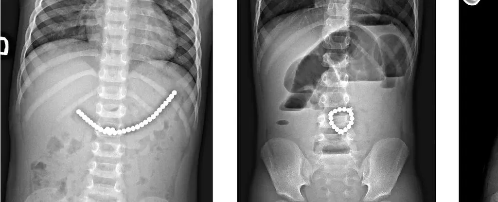 儿童吞食小型磁珠后的 X 光片。来源:Da?kevi?iūt? et al.,2017