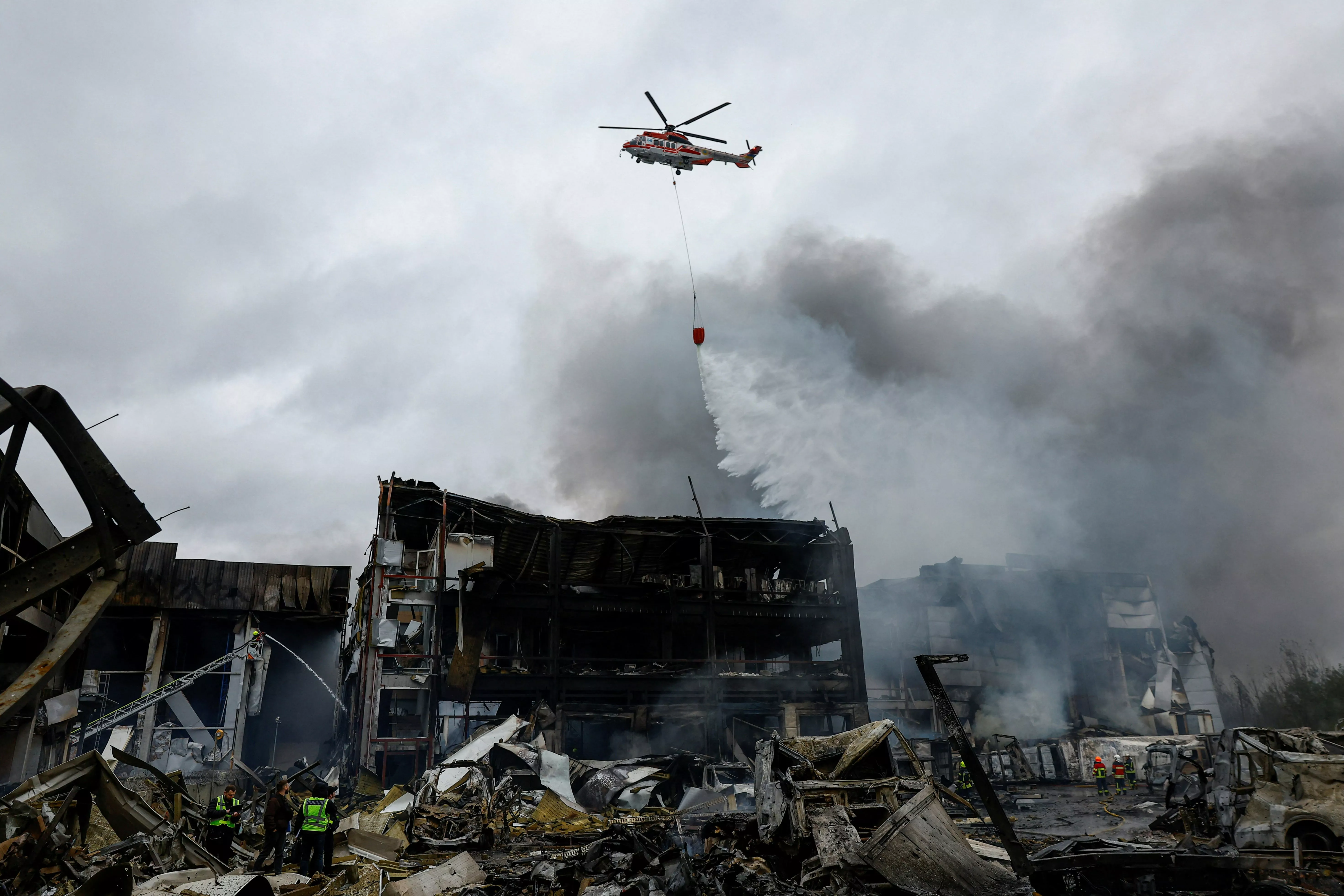 2025年10月25日,乌克兰基辅,图为一架消防直升机在遇袭烧毁的仓库上泼洒灭火剂。(Reuters)