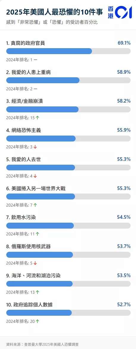 有最新民调刊出美国人2025年最恐惧事件调查,结果显示,美国人最害怕贪腐的政府官员。