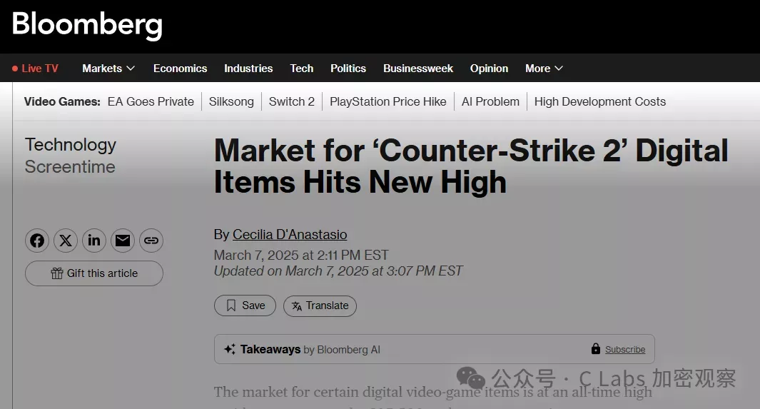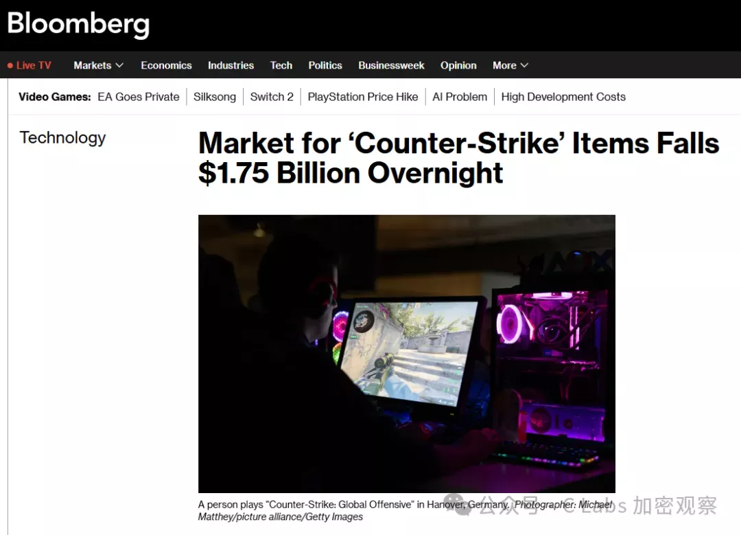 年初时彭博社曾报道,《反恐精英2》(CS2)皮肤投资是表现最佳的资产类别之一,今年以来涨幅超70%,远胜传统市场。