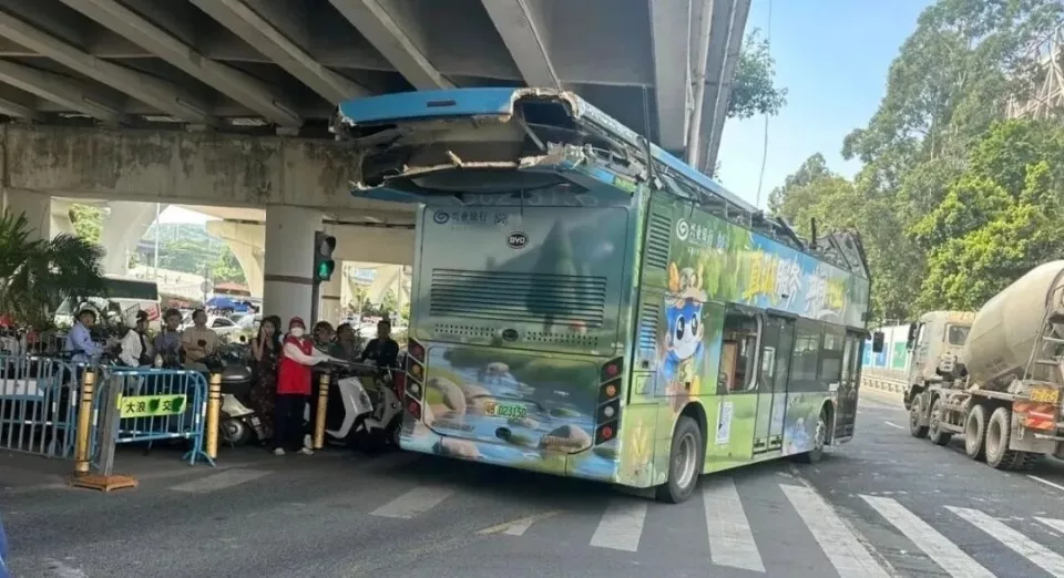 10月26日,广东深圳一辆双层巴士顶部在高架桥下被严重挤压变形,引发关注。