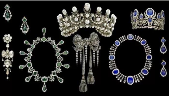 ▲被盗的玛丽-阿梅莉王后与奥尔唐斯王后的冠冕、蓝宝石项链及蓝宝石耳环。