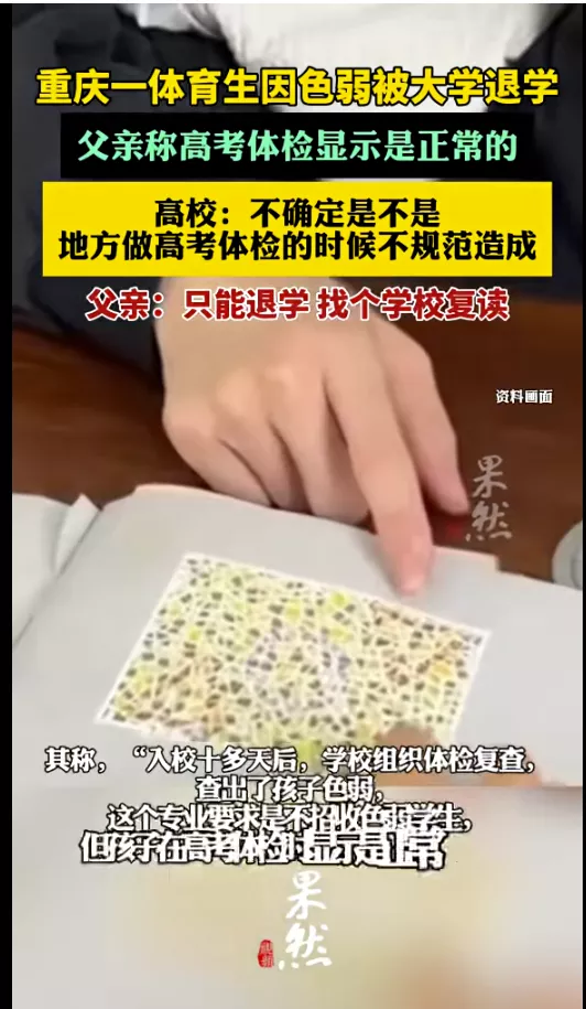 近日,重庆市合川区市民黄先生反映自家孩子孙某某系2025年应届高考体育特长生,因“色觉异常”被遵义医科大学退学,而在去年12月的高考体检中,该问题并未被检出。