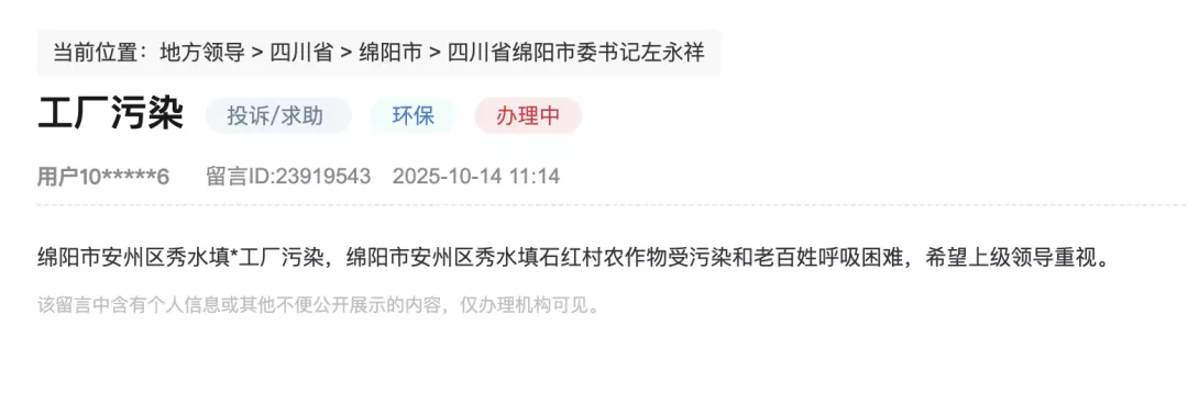2、10月15日,ID“23927852”给四川省委书记王晓晖留言:“朝*磷肥厂污染我们的农作物和我们老百姓的身体,几个月了越来越严重,到现在还没给老百姓一个处理方案,他们又在开始生产了 2025年8月13号,农作物大面积受伤害,直到10月9号早上老百姓呼吸磷肥化工厂的气体,又一次出现烟雾刺鼻,10月10号早上竹林树木叶子全落,希望领导重视。”