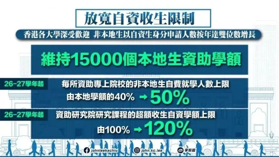 同时,2024年起,香港高校开始了扩招。官方公告里提到,自2024/2025学年开始,特区政府决定放宽“政府资助大学”招收非本地学生的比例限制:原本每所大学的“非本地生”(包括内地、澳门、台湾及海外学生)占比最多不得超过总入学人数的20%,新政策将这一比例上限提升至40%。
