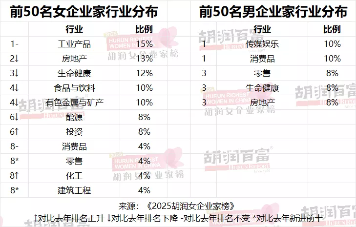 反观胡润百富榜前50名男企业家,其行业分布特点有所不同:传媒娱乐行业与消费品行业表现最为突出,二者人数占比均为10%;而零售行业、生命健康行业与房地产行业则以8%的相同占比并列第三。