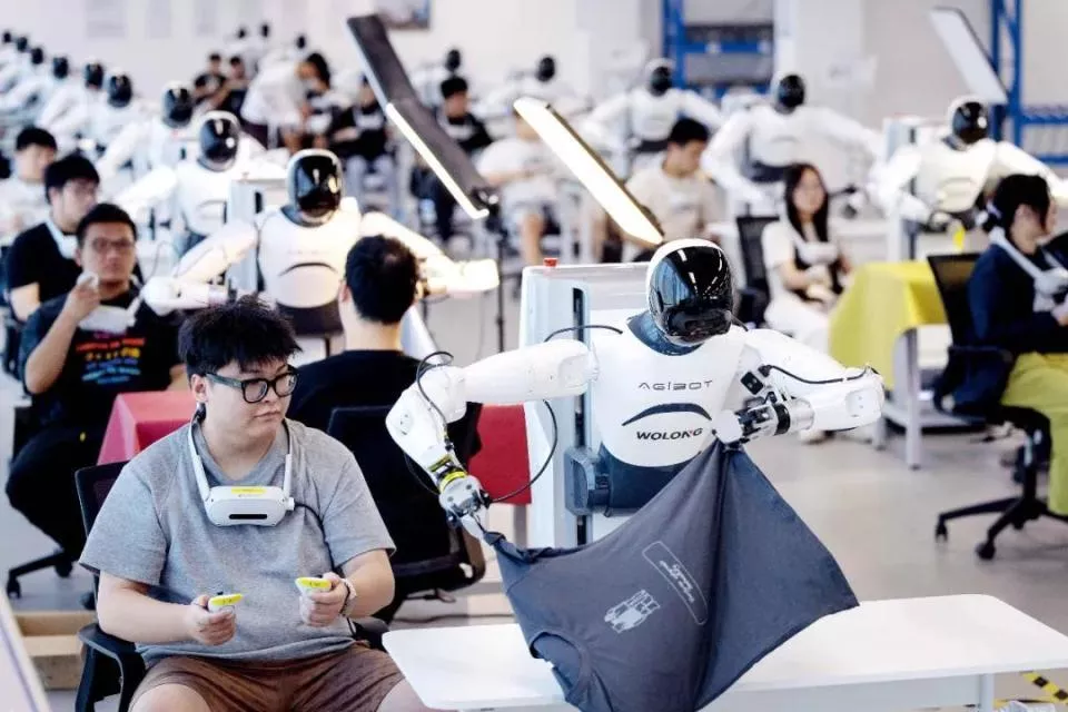 2025年9月14日,在位于浙江绍兴上虞区的杭州湾具身智能创新中心,50台人形机器人在数据采集区跟着技术人员学习各种岗位技能。图/视觉中国