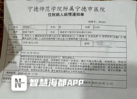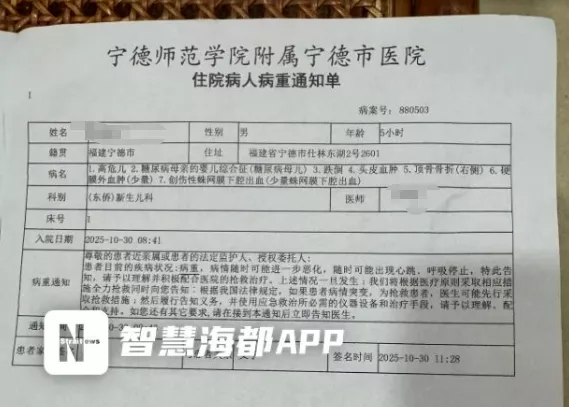 10月30日,宁德市民林先生向智慧海都APP反映称,其妻子在宁德师范学院附属宁德市医院完成分娩后,在与新生儿一同从产房转送至病房的途中,疑因推车护栏未锁紧,新生儿从推车上坠落,致右顶骨骨折。