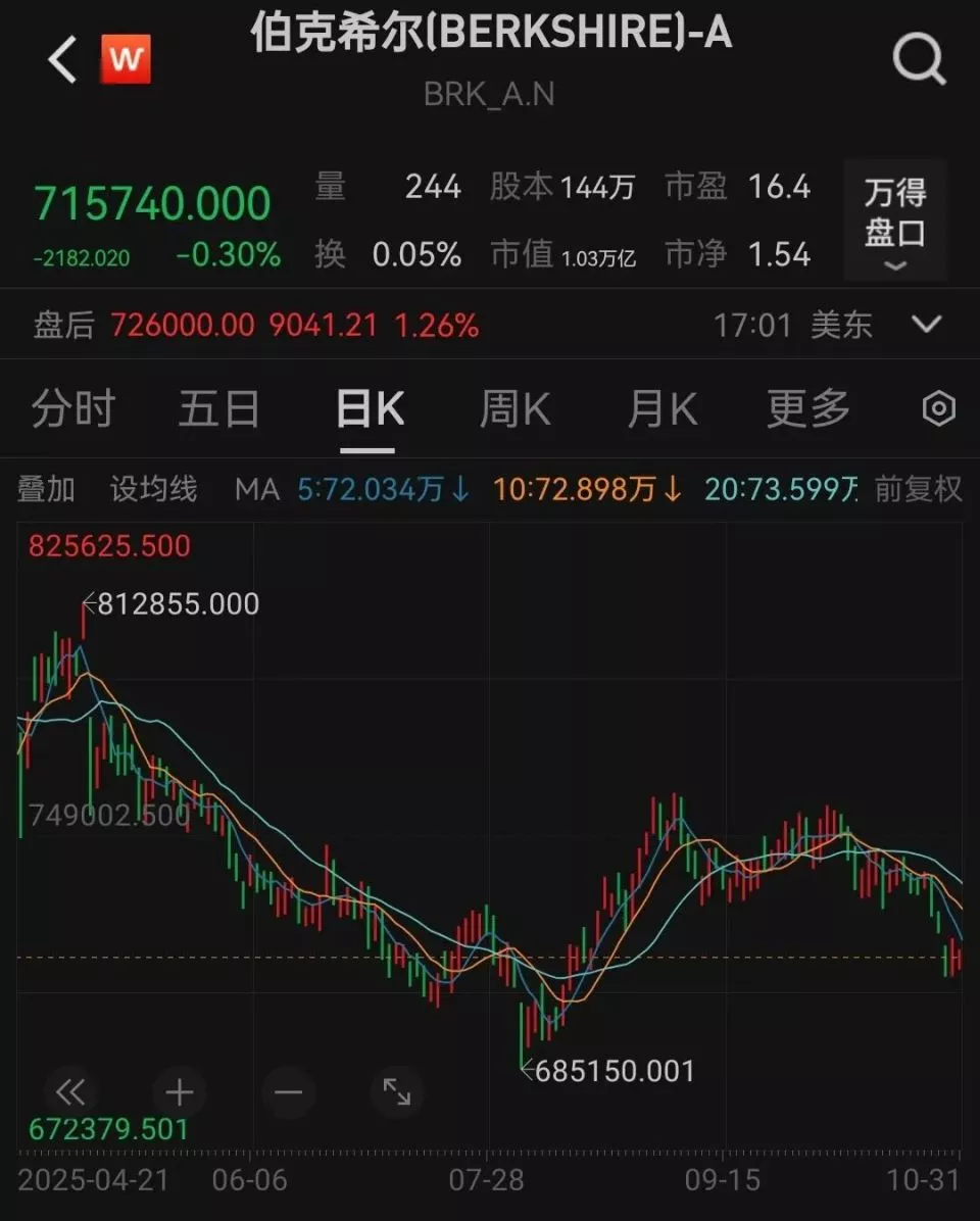 自那以来,伯克希尔-A类股跌超11%,同期标普500指数上涨了20%。