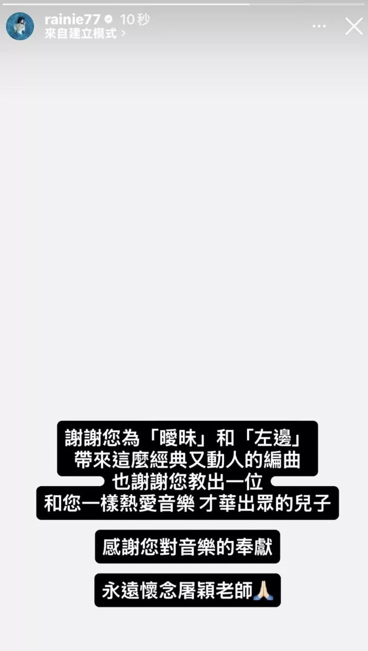 屠颖曾替杨丞琳〈暧昧〉编曲,杨丞琳也透过IG限时动态哀悼,“谢谢您为〈暧昧〉和〈左边〉带来这么经典又动人的编曲,感谢您对音乐的奉献。”