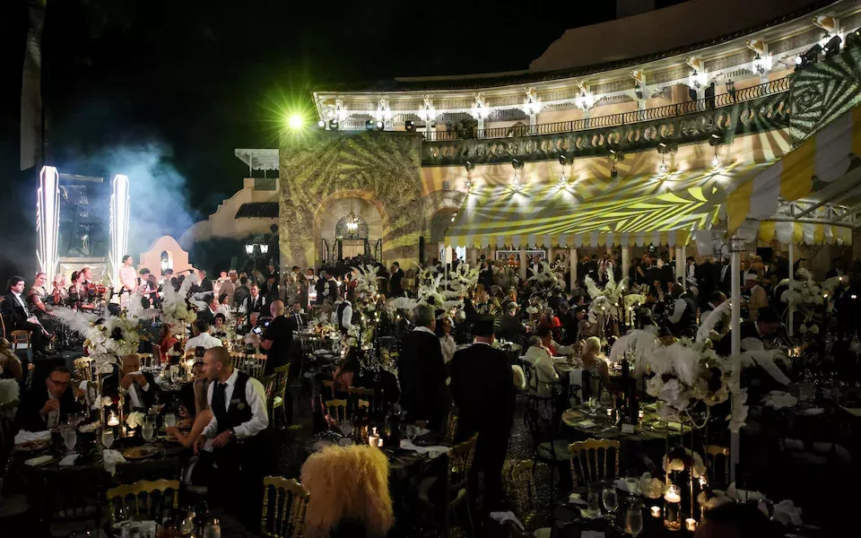 在一张活动照片中,一名舞女在一个巨大的镀金马提尼酒杯中摆造型,而视频片段则展现了歌舞女郎们表演着精心编排的舞蹈。其他照片则显示,现场有一个巨大的主题冰雕用于冰镇酒水,还有各式各样、琳琅满目的甜点。