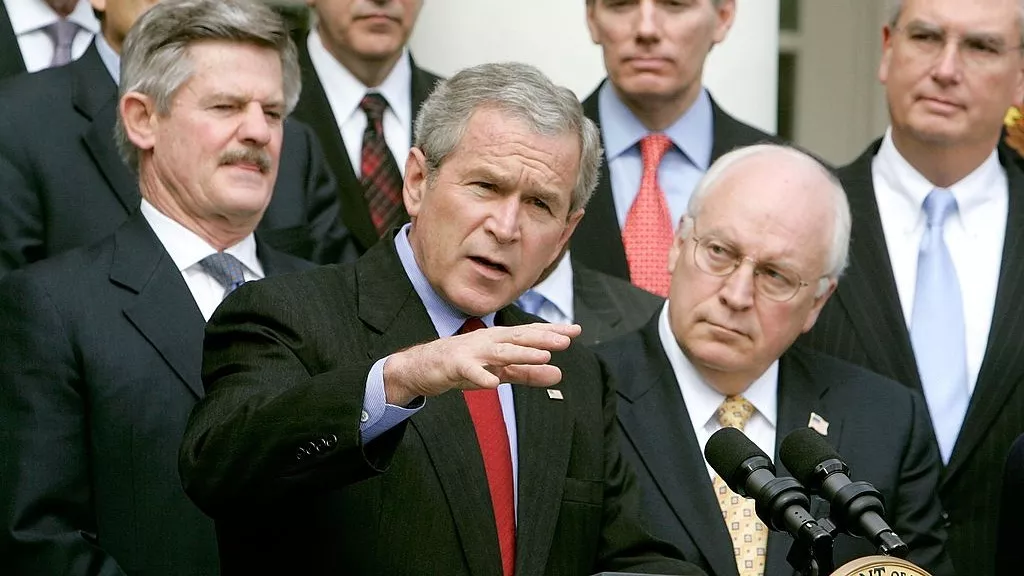 2006年3月28日,美国小布什(George W. Bush,左)在华盛顿白宫玫瑰园发表演说前,副总统切尼(Dick Cheney,右)及其他内阁成员陪同在侧。(Getty)
