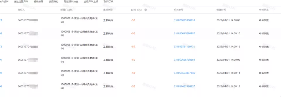 第二次则更为离谱。站点分发给我不合格的雨衣——只有达达标志而没有山姆logo。就这样两天被抽检6次,扣掉了我整整300元。系统申诉无果,站长承诺“发工资前帮忙争取”,到最后不了了之,又是我自己吞下苦果。