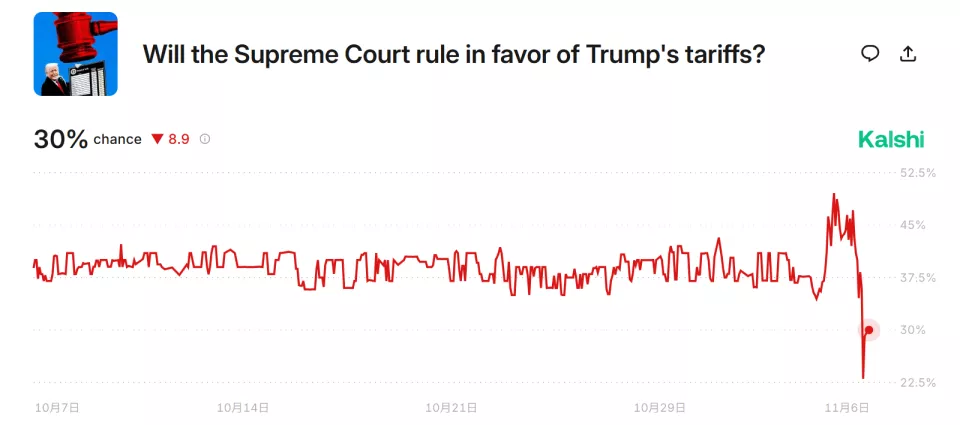 随着高院庭审细节不断刷新,预测市场的交易者们大幅降低了法院会支持特朗普关税的概率。