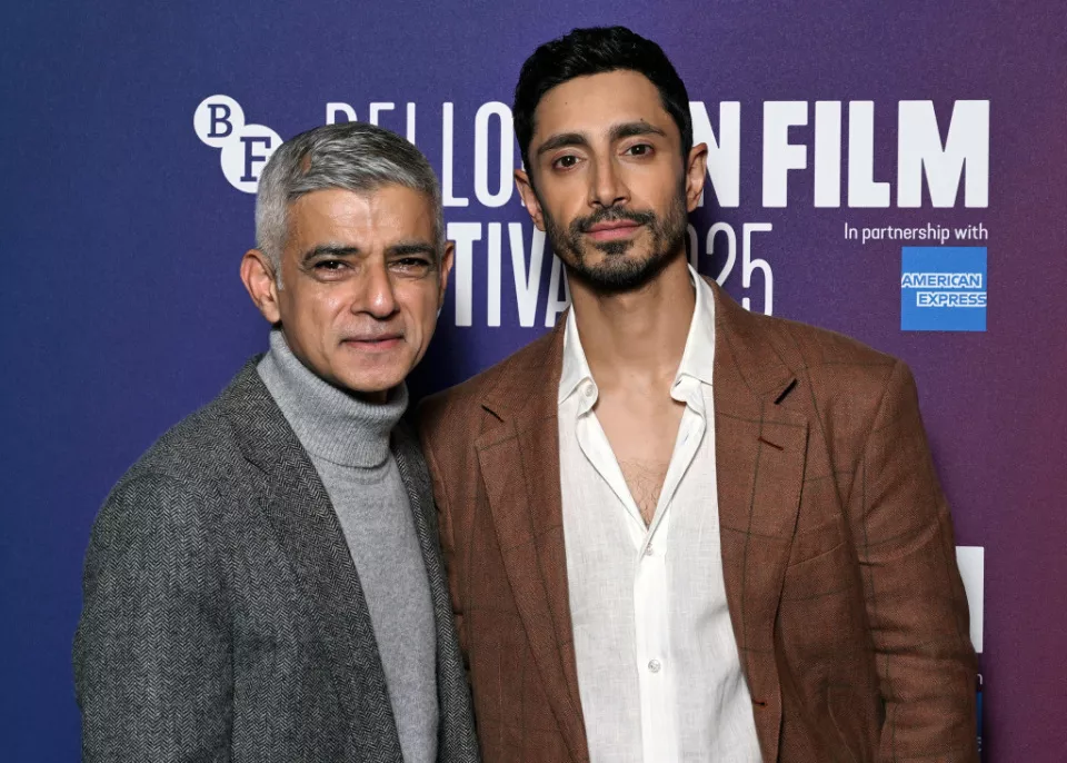 当地时间2025年10月13日,英国伦敦,伦敦市长萨迪克·汗和里兹·艾哈迈德出席第69届伦敦电影节在梅费尔库宗电影院举行的《哈姆雷特》放映活动。视觉中国