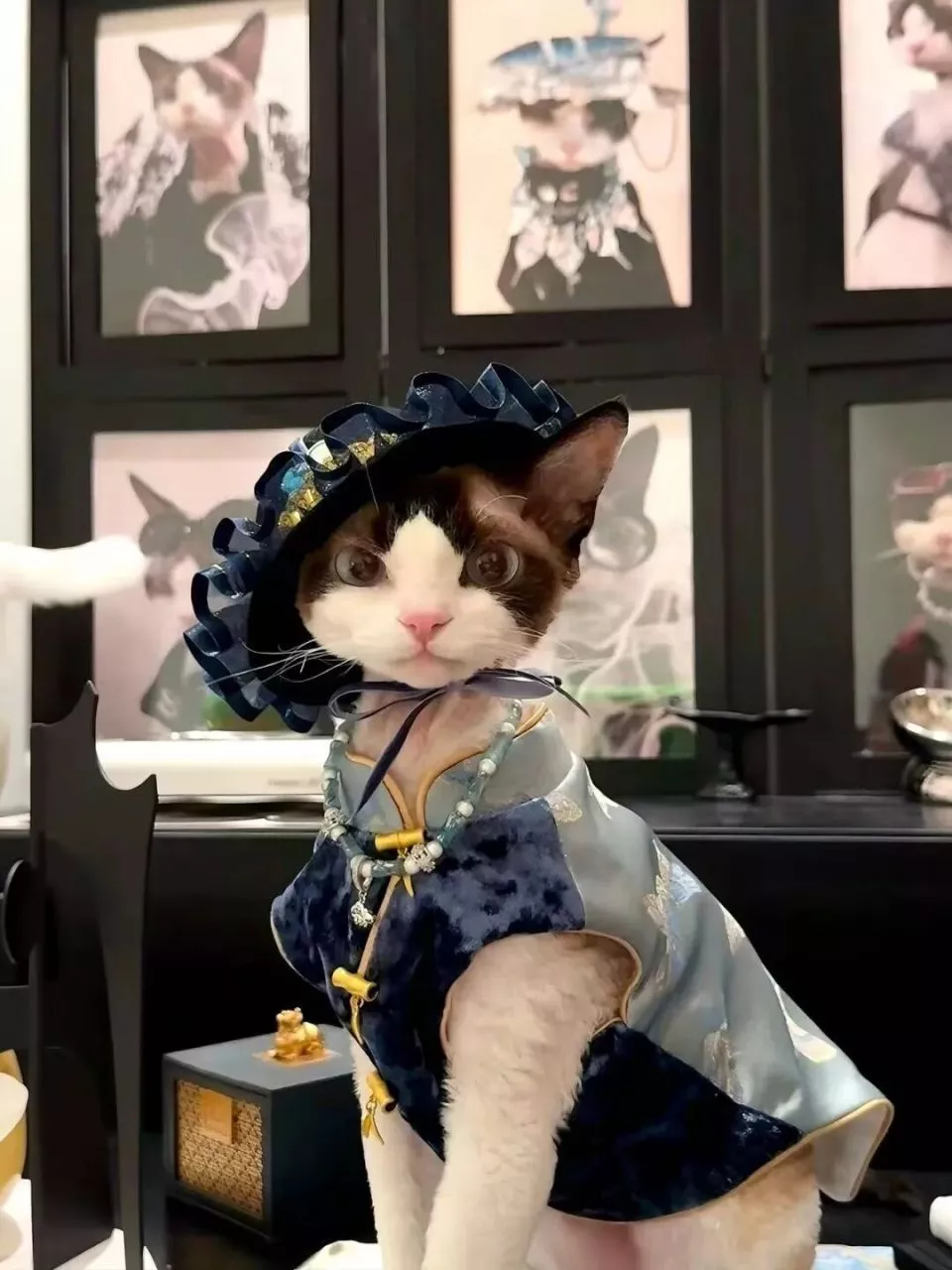 一开始,我想给我家的长毛猫买个口水巾,结果发现不管在哪个平台,几乎都找不到新中式风格的宠物服装。即便有,质感也很差。市面上更常见的款式虽然像童装,却远没有达到真正童装或婴儿级面料的质量。