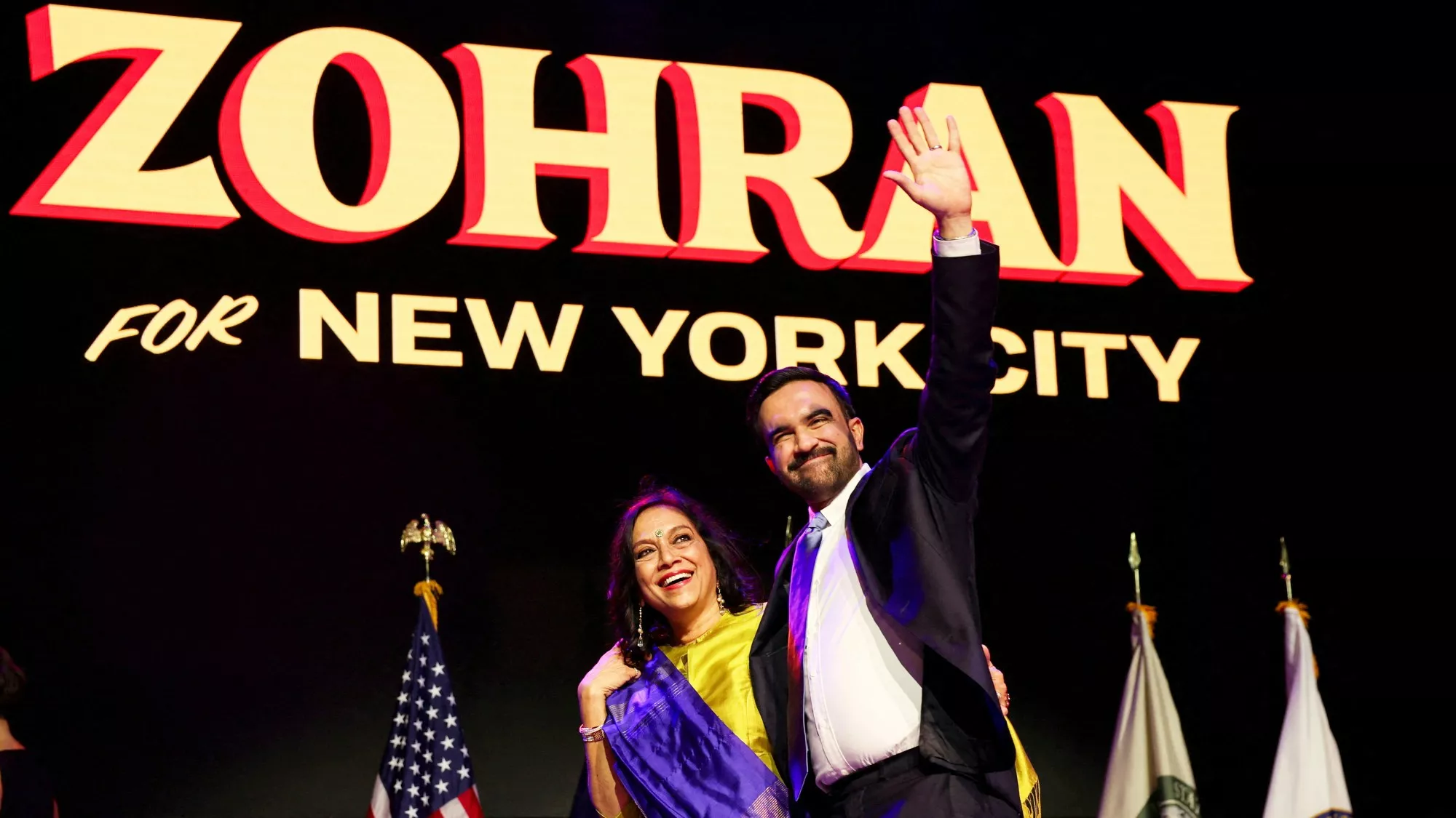 2025年11月4日,美国纽约市,民主党左翼候选人曼达尼(Zohran Mamdani)赢得2025年纽约市长选举后,在选举之夜的集会上与其母亲一同在台上挥手致意。(Reuters)