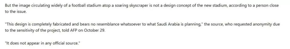 不过,目前申办计划书和新未来城NEOM官方账号提供的空中球场概念图,都与网传视频有一定差别。法新社在10月31日引用该项目相关人士称,“(网传视频)这个设计完全是捏造的,与沙特阿拉伯的计划没有任何相似之处。”