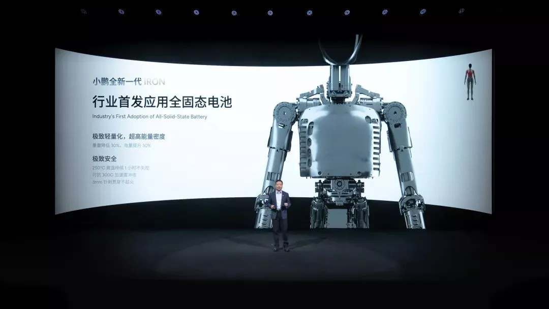 此外,小鹏还在行业内首发应用全固态电池。为啥不先用在车上?何小鹏解释说:机器人要进家庭、办公室,对安全性要求更高,正好拿来当试验平台。
