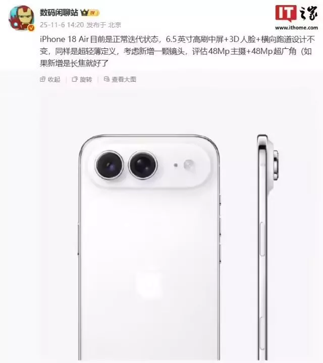 而在昨天(11 月 6 日),微博博主发文透露,iPhone 18 Air 目前是正常迭代状态,6.5 英寸高刷中屏 + 3D