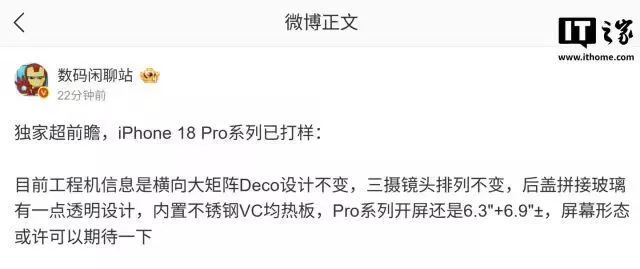 同样是在今天的博文中,博主还爆料称iPhone 18 Pro Max