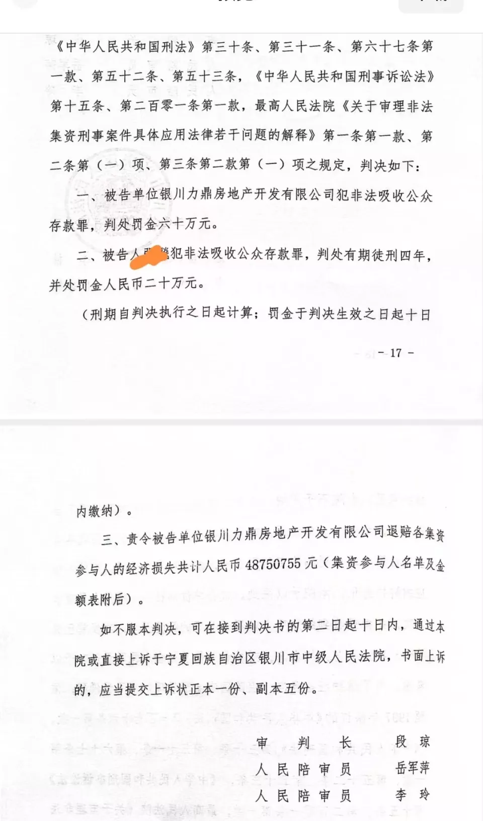 杜先生提供的《宁夏回族自治区银川市兴庆区人民法院刑事判决书》(2021)宁0104刑初751号显示:判决:一、被告单位银川力鼎房地产开发有限公司犯非法吸收公众存款罪,判处罚金六十万元。二、被告人强某犯非法吸收公众存款罪,判处有期徒刑四年,并处罚金人民币二十万元。