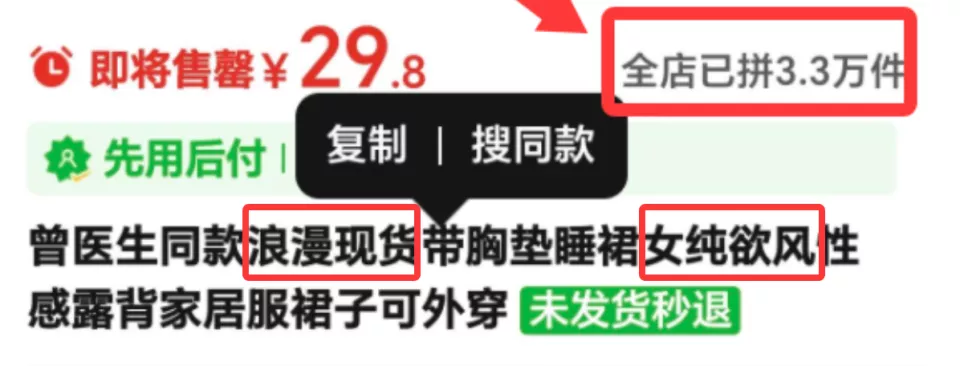 而且更让人惊奇的是,一款平平无奇的睡衣,这位老板在紧跟时事把睡衣上架了之后,还给这家衣服加了几个形容词——“浪漫现货”、“女纯欲风”、“性感居家服”……这销量立马就卖爆了: