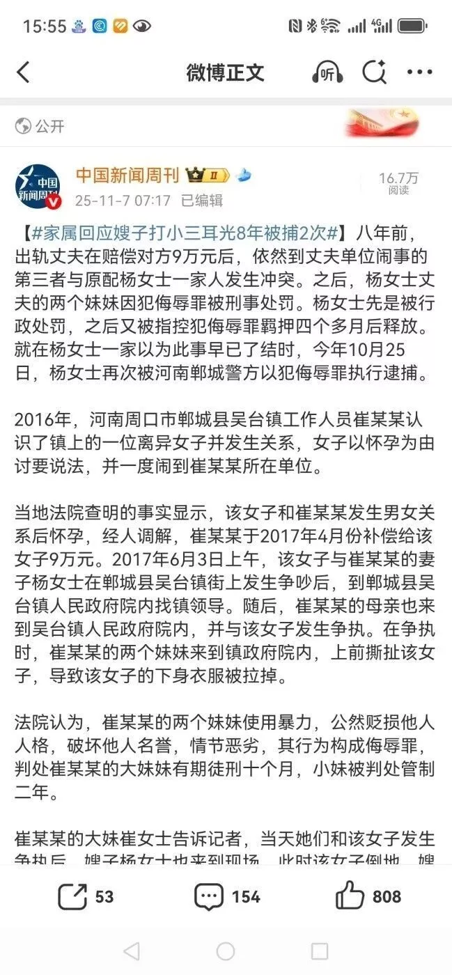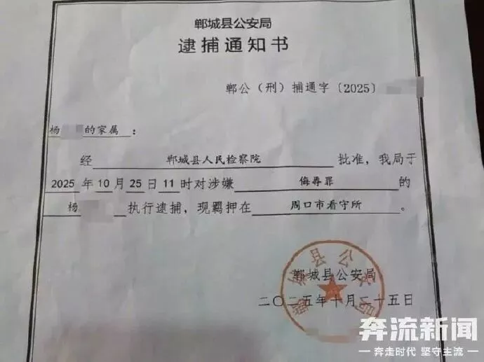 中国新闻周刊:八年前,出轨丈夫在赔偿对方9万元后,依然到丈夫单位闹事的第三者与原配杨女士一家人发生冲突。之后,杨女士丈夫的两个妹妹因犯侮辱罪被刑事处罚。杨女士先是被行政处罚,之后又被指控犯侮辱罪羁押四个多月后释放。就在杨女士一家以为此事早已了结时,今年10月25日,杨女士再次被河南郸城警方以犯侮辱罪执行逮捕。