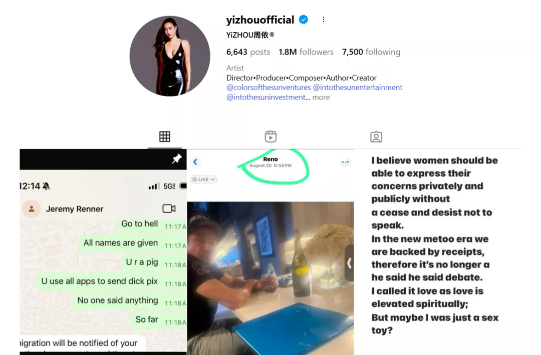 中国女导演周依表示,雷纳曾对她发送大量的私密不雅照,明显性暗示的文字内容,更是在曾酒后对她大吼两小时,甚至威胁要“报警并联系美国移民局(ICE)”以恐吓她。