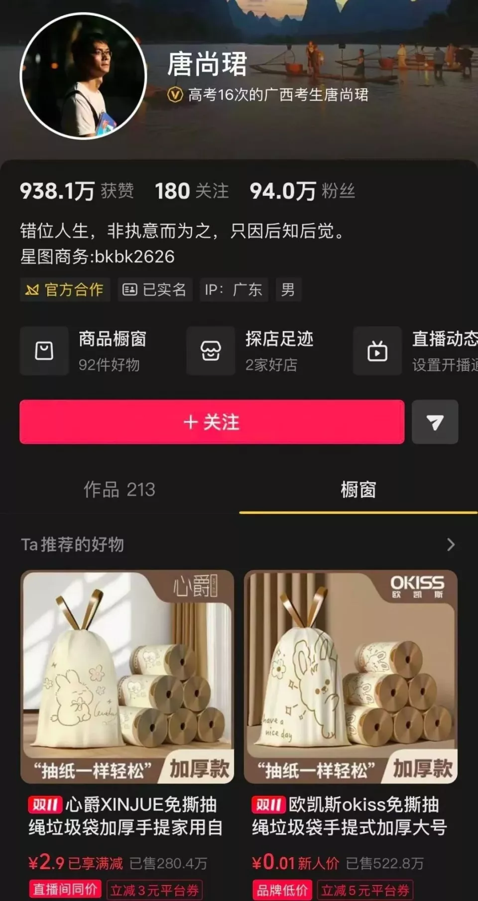 目前,唐尚珺在抖音平台粉丝数达94万,商品橱窗有92件产品,多为抽纸、垃圾袋等生活用品。