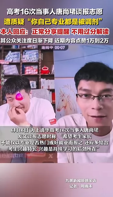 6月16日,为上清华高考16次当事人唐尚珺发文谈报志愿时称,“希望考生家长不能仅以专业是否热门或者好就业而报之,还应该多多结合考生兴趣特长,毕竟兴趣是持续学习的后劲所在。”评论区有人指出其专业都是被调剂,质疑其没资格指导别人。