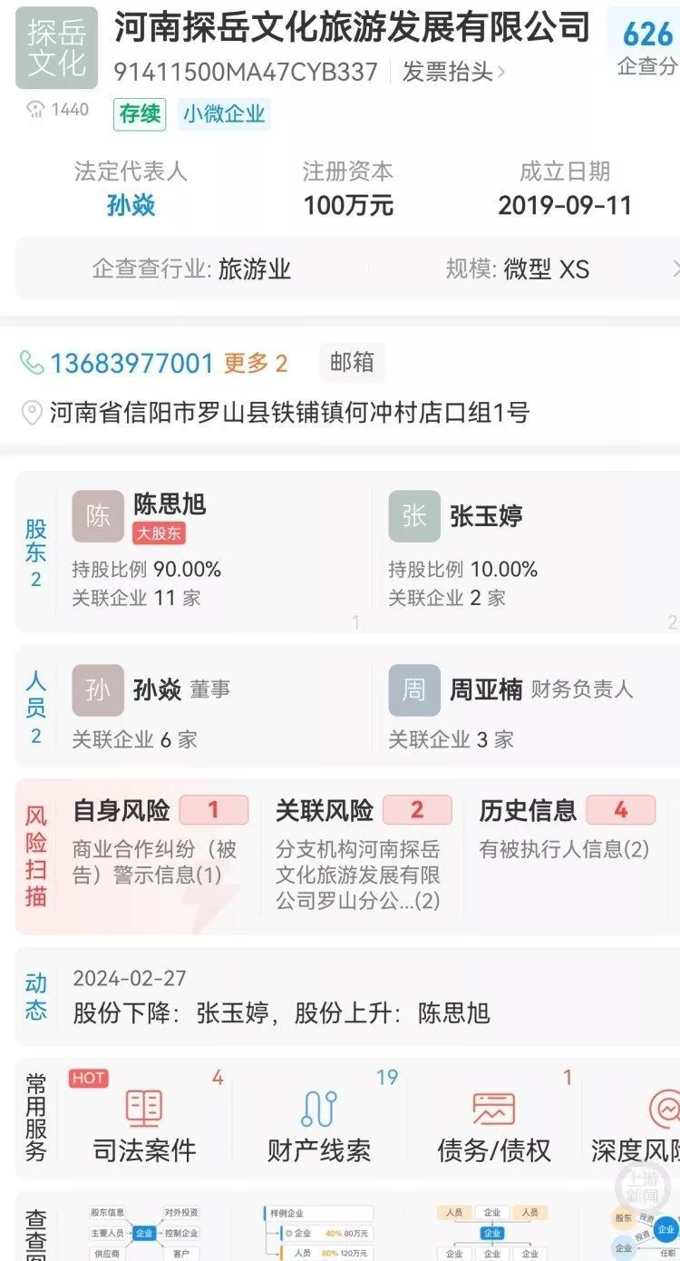 工商登记信息显示,探岳公司成立于2019年9月,注册资本100万元,是一家微型企业。